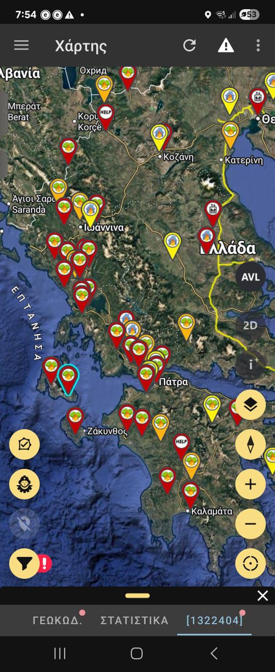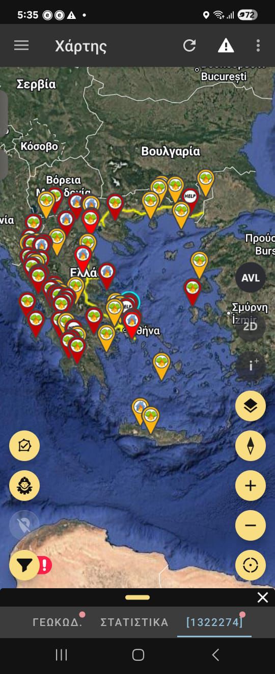 H Επιχειρησιακή εικόνα με γεωγραφικό προσδιορισμό των συμβάντων, τα μέσα και το προσωπικό. Με κόκκινο είναι οι εν εξελίξει πυρκαγιές
