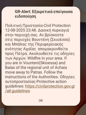 Εκδόθηκαν νέες οδηγίες για απομάκρυνση των κατοίκων από τις περιοχές Καμενίτσα, Αχαϊκό, Διδαχέικα, Αλισσός, Λουσικά, Σπαλιαρέικα, προς την Κάτω Αχαΐα.