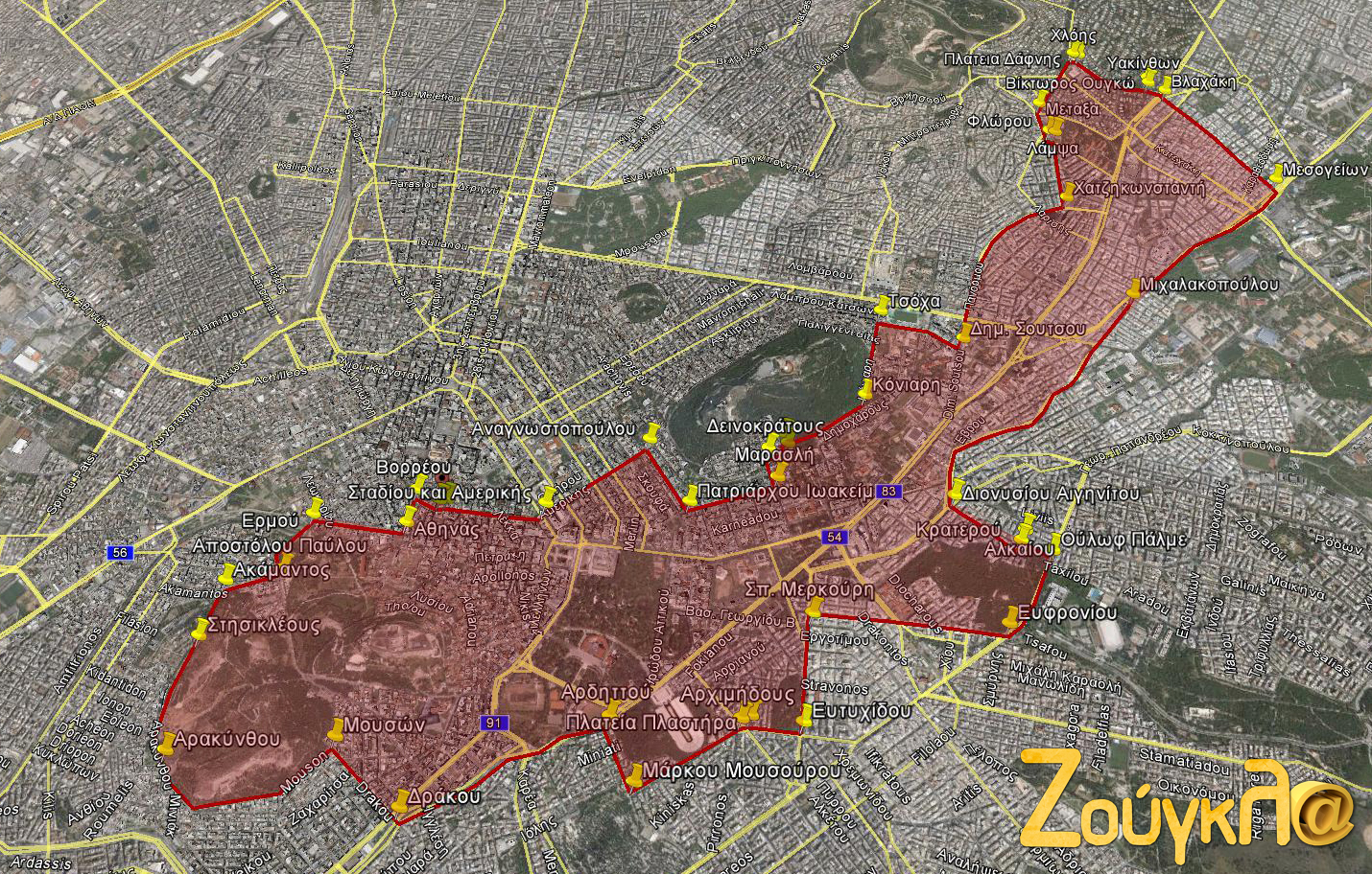 - στην περιοχή που περικλείεται από τους εξής δρόμους: Αμερικής (από τη συμβολή της με την οδό Σταδίου) – συνέχεια Λυκαβηττού – δεξιά Αναγνωστοπούλου – αριστερά Πατριάρχου Ιωακείμ – αριστερά Μαρασλή – δεξιά Δεινοκράτους – αριστερά Αριστοδήμου – δεξιά Αθηναίων Εφήβων – αριστερά Κόνιαρη – δεξιά Τσόχα – αριστερά Δ. Σούτσου – συνέχεια Πανόρμου – αριστερά Χατζηκωνσταντή – αριστερά Λάμψα – δεξιά Φλώρου – δεξιά Μεταξά – Πλατεία Δάφνης – δεξιά Χλόης – αριστερά Υακίνθων – δεξιά Βίκτωρος Ουγκώ – έναντι Βεάκη – συνέχεια Βλαχάκη – δεξιά Μεσογείων – αριστερά Μιχαλακοπούλου – αριστερά Διονυσίου Αιγηνίτου – αριστερά Κρατερού – δεξιά Αλκαίου – δεξιά Ούλωφ Πάλμε – δεξιά Ευφρονίου – αριστερά Σπ. Μερκούρη – δεξιά Ευτυχίδου – Πλατεία Πλαστήρα – Αρχιμήδους – δεξιά Μάρκου Μουσούρου – αριστερά Αρδηττού – συνέχεια Καλλιρρόης – δεξιά Δράκου – αριστερά Μουσών – συνέχεια Παναιτωλίου – Αρακύνθου – Στησικλέους – δεξιά Ακάμαντος – αριστερά Αποστόλου Παύλου – δεξιά Ερμού – αριστερά Αθηνάς – δεξιά Βορρέου – αριστερά Αιόλου – δεξιά Κολοκοτρώνη – Αμερικής, συμπεριλαμβανομένων των τμημάτων των ανωτέρω οδών που αποτελούν τα όρια της εν λόγω περιοχής.
