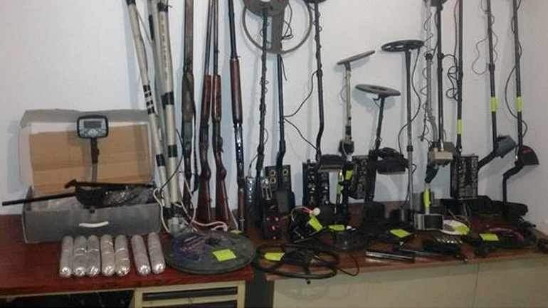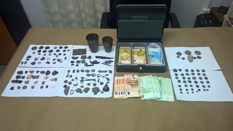 Όπως ανακοίνωσε η Αστυνομία, μετά από κατάλληλη αξιολόγηση και αξιοποίηση στοιχείων, διενεργήθηκαν νομότυπες έρευνες στις οικίες και αποθήκες των τριών ανδρών συλληφθέντων, κατά τις οποίες βρέθηκαν και κατασχέθηκαν συνολικά 66 αρχαία νομίσματα, 25) αρχαία κοσμήματα, πλήθος μεταλλικών και λίθινων αντικειμένων και εργαλείων, 12 ανιχνευτές μετάλλων, τρεις γεωμαγνητικοί εντοπιστές, επτά συσκευασίες εκρηκτικών, συνολικού βάρους (5.075 γραμμαρίων, ένα πιστόλι αερίου με έξι αμπούλες αερίου και 230 μεταλλικά σφαιρίδια, τρία κυνηγετικά όπλα, χωρίς άδεια κατοχής, μία κυνηγετική καραμπίνα, με άδεια κατοχής, 128 φυσίγγια διαφόρων τύπων και διαμετρημάτων, δύο γεμιστήρες πολεμικού τυφεκίου, μία σπάθα και μία διόπτρα, το χρηματικό ποσό των 15.500 €.