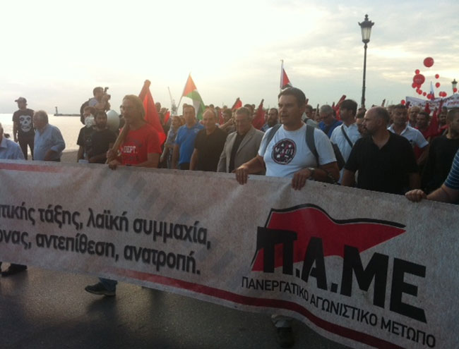 Μέλη του ΠΑΜΕ κατέφθασαν στην πλατεία Αριστοτέλους, ενώ το παρών έδωσε ο γενικός γραμματέας του ΚΚΕ Δημήτρης Κουτσούμπας.