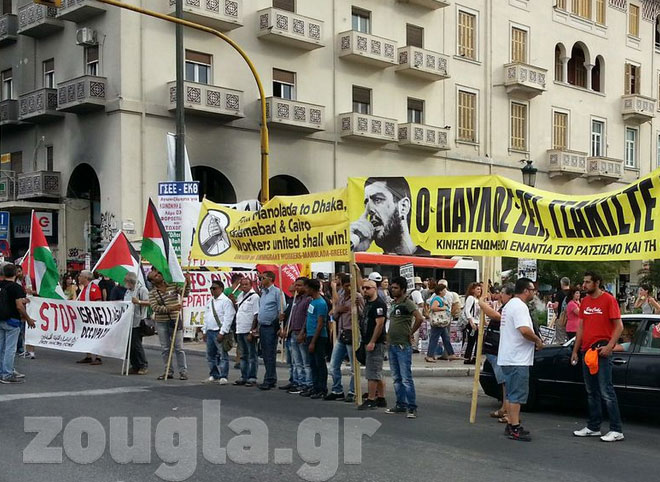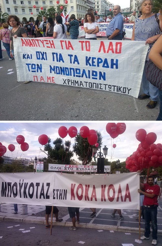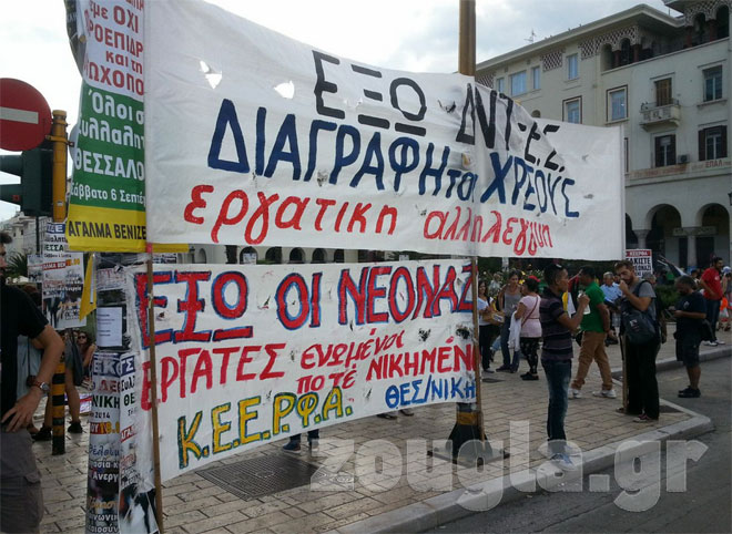 Σωματεία και οργανώσεις της εξωκοινοβουλευτικής Αριστεράς, η Λαϊκή Αντίσταση – Αριστερή Αντιιμπεριαλιστική Συνεργασία (ΛΑ -ΑΑΣ), το Μ-Λ ΚΚΕ, το ΚΚΕ (μ-λ), η ΑΝΤΑΡΣΥΑ κ.ά. συγκεντρώθηκαν στην Καμάρα και οι επιτροπές αγώνα κατά της εξόρυξης χρυσού στις Σκουριές Χαλκιδικής στην πλατεία Αγίας Σοφίας.