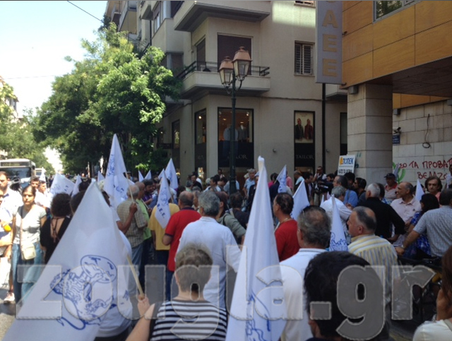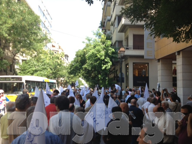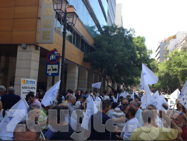 Συγκέντρωση διαμαρτυρίας πραγματοποιούν αυτήν την ώρα δεκάδες μέλη της ΓΣΕΒΕΕ έξω από το κτήριο του ΟΑΕΕ, επί της οδού Ακαδημίας, στο κέντρο της Αθήνας.