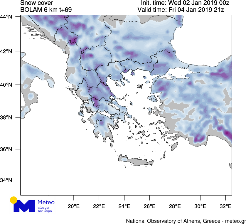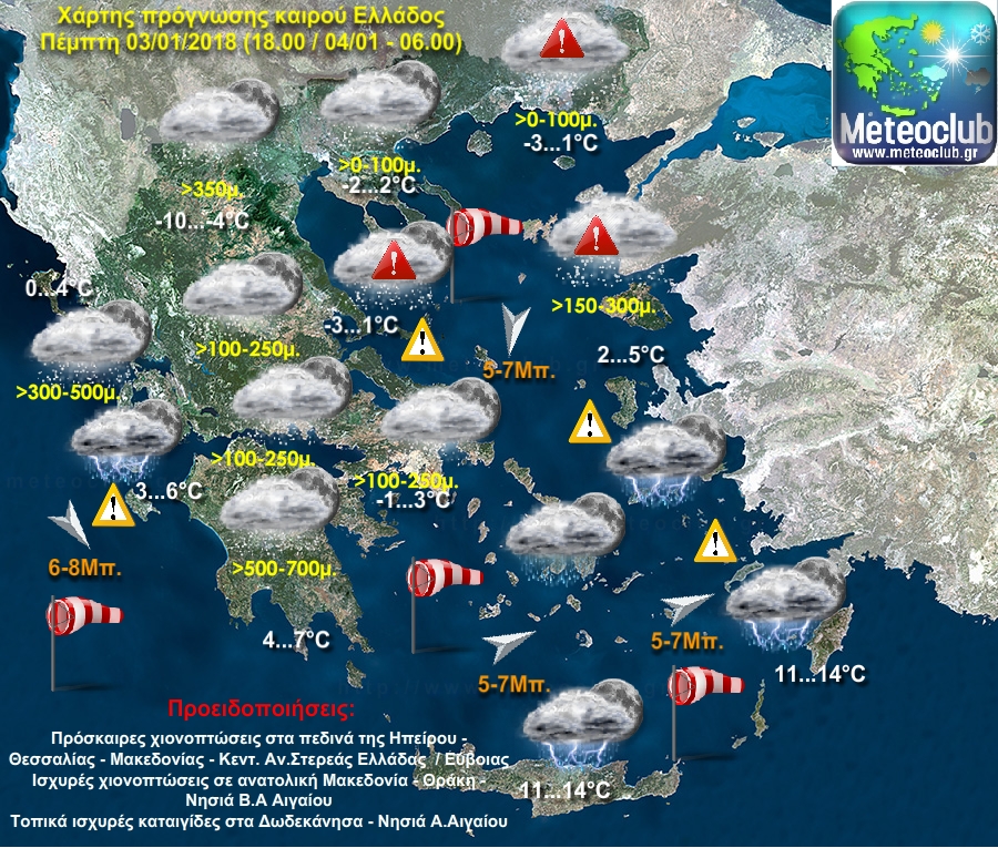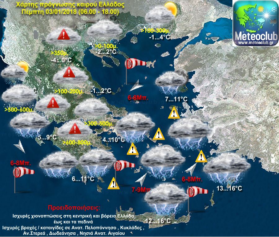 Τέλος για την ανατολική Στερεά Ελλάδα και την Εύβοια αρχικά προβλέπονται βροχές και τοπικά έντονες καταιγίδες προς τις μεσημβρινές ώρες , χιονοπτώσεις αρχικά στα ορεινά τμήματα άνω των 700μ. και προοδευτικά από αργά το μεσημέρι και μέσα στο απόγευμα τα υψόμετρα χιονόπτωσης θα κατεβαίνουν ώρα με την ώρα. Τη νύχτα θα χιονίσει και σε πεδινές περιοχές της Αττικής- Βοιωτίας – Εύβοιας έως τα 100-200μ. υψόμετρο.