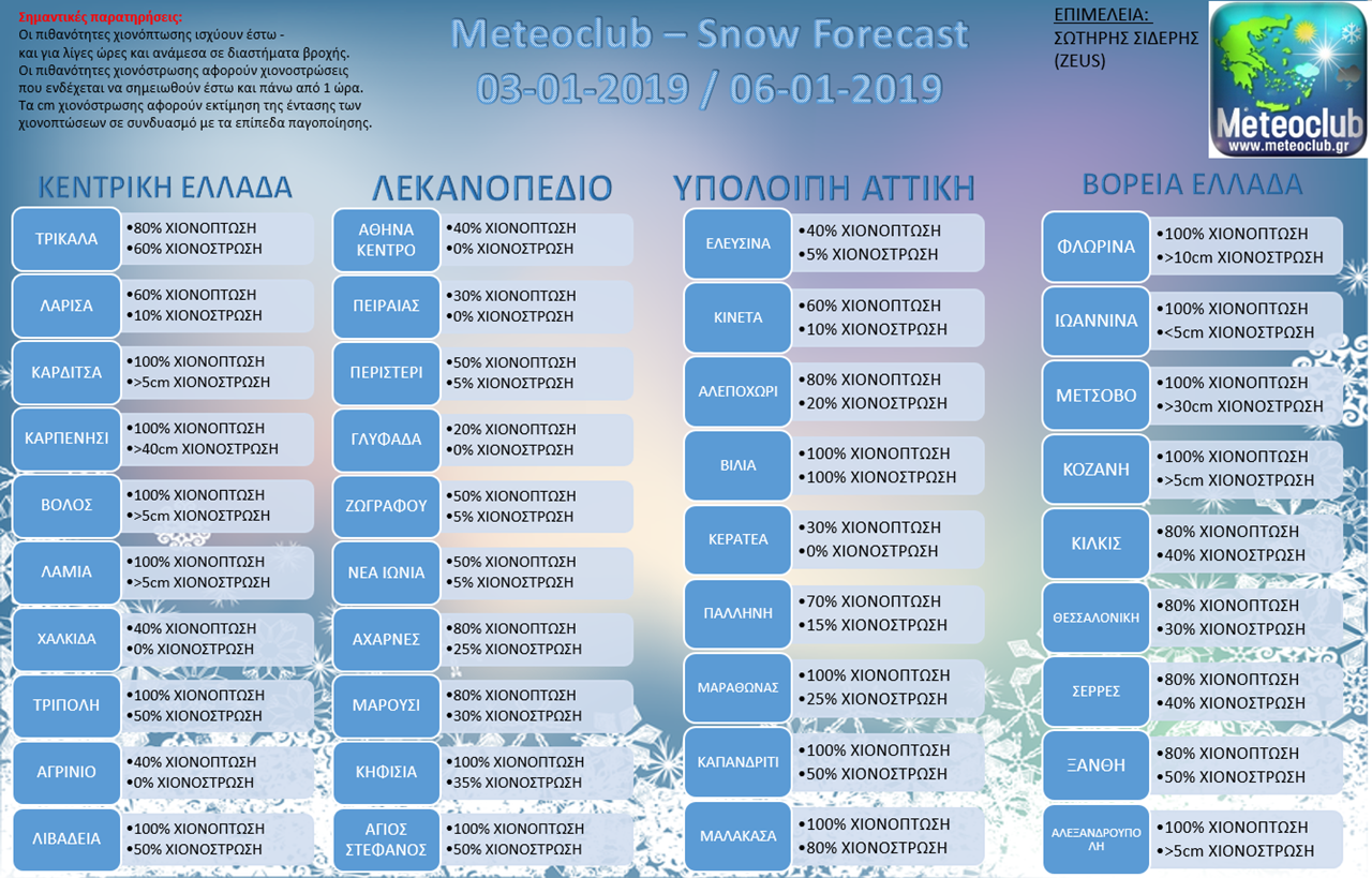 - Τα πολύ έντονα καιρικά φαινόμενα (από πλευράς χιονοπτώσεων) θα εντοπιστούν σε αρκετά μεγάλο τμήμα της κεντρικής – ανατολικής Θεσσαλίας στους νομούς Καρδίτσας – Λάρισας – Μαγνησίας , στη δυτική – κεντρική Στερεά Ελλάδα και στους νομούς Βοιωτίας – Φθιώτιδας – Φωκίδας – Ευρυτανίας , στην Ήπειρο (νομός Ιωαννίνων) , στη δυτική Μακεδονία (νομός Γρεβενών – Κοζάνης – Φλώρινας)