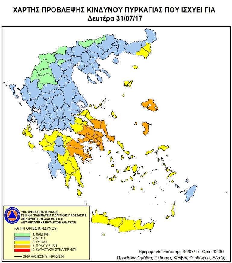 Πολύ υψηλός κίνδυνος πυρκαγιάς (κατηγορία κινδύνου 4) προβλέπεται για την Δευτέρα 31 Ιουλίου, σύμφωνα με τον Χάρτη Πρόβλεψης Κινδύνου Πυρκαγιάς που εκδίδει η γενική γραμματεία Πολιτικής Προστασίας του υπουργείου Εσωτερικών.