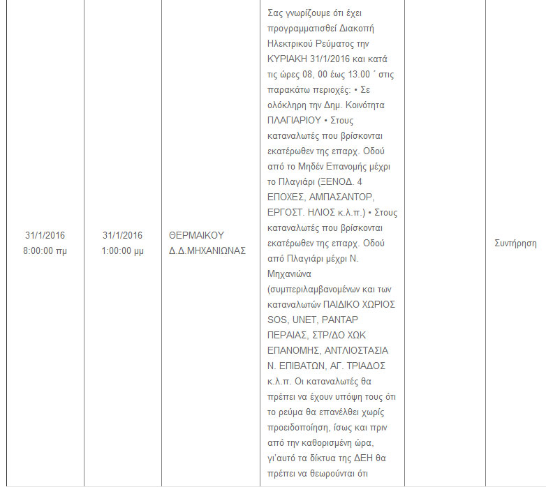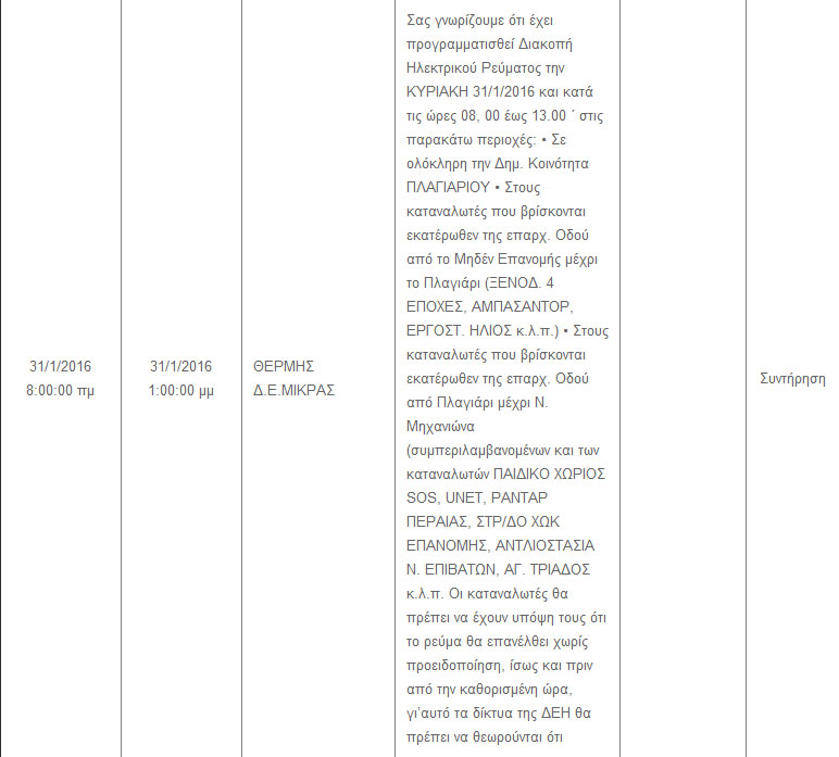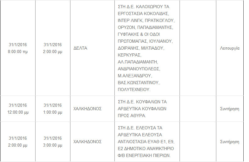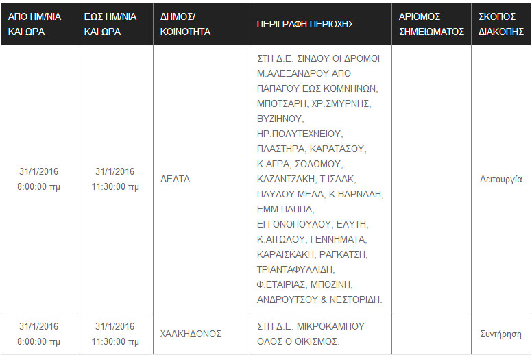 Διακοπές στο δίκτυο ηλεκτροδότησης θα σημειωθούν σήμερα, Κυριακή 31 Ιανουαρίου, σε διάφορες περιοχές της Θεσσαλονίκης.
