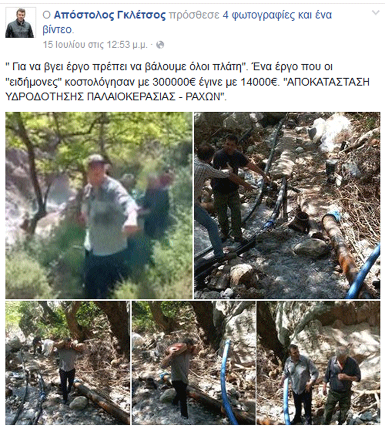 «”Για να βγει έργο πρέπει να βάλουμε όλοι πλάτη”. Ένα έργο που οι ”ειδήμονες” κοστολόγησαν με 300.000 ευρώ έγινε με 14.000 ευρώ. ”ΑΠΟΚΑΤΑΣΤΑΣΗ ΥΔΡΟΔΟΤΗΣΗΣ ΠΑΛΑΙΟΚΕΡΑΣΙΑΣ – ΡΑΧΩΝ”» έγραψε o Γκλέτσος.