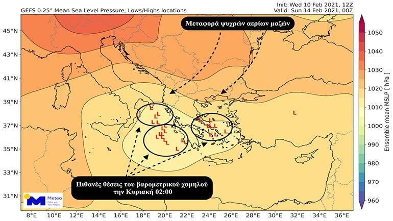 »Αυτό γίνεται προφανές από τις προγνώσεις πολλαπλού δείγματος της θέσης του βαρομετρικού χαμηλού για τις βραδινές ώρες του Σαββάτου προς τις πρωινές ώρες της Κυριακής. Όπως παρατηρούμε στο γράφημα 1, οι πιθανές θέσεις αποκλίνουν πολύ μεταξύ τους, με κάποια σενάρια να προβλέπουν τη θέση του στο Βόρειο Ιόνιο και κάποια άλλα στο Νότιο, ενώ ένα μέρος των πιθανών θέσεων είναι στο Κεντρικό Αιγαίο. Αυτό έχει ως αποτέλεσμα τη μεγάλη αβεβαιότητα στην κατανομή των χιονοπτώσεων και στην έντασή τους. Για παράδειγμα, αν επαληθευτεί ένα σενάριο όπου το βαρομετρικό χαμηλό βρίσκεται στο Βόρειο Ιόνιο, τότε η ζώνη των έντονων χιονοπτώσεων θα εντοπίζεται στη Δυτική Μακεδονία, στα ορεινά της Ηπείρου και στη Δυτική Θεσσαλία. Σε ένα άλλο όμως σενάριο όπου το βαρομετρικό χαμηλό βρεθεί στο Κεντρικό και Νότιο Ιόνιο, τα έντονα φαινόμενα θα εντοπίζονται πιο νότια και οι χιονοπτώσεις στην Ήπειρο πιθανώς να εντοπίζονται σε ακόμα χαμηλότερα υψόμετρα.