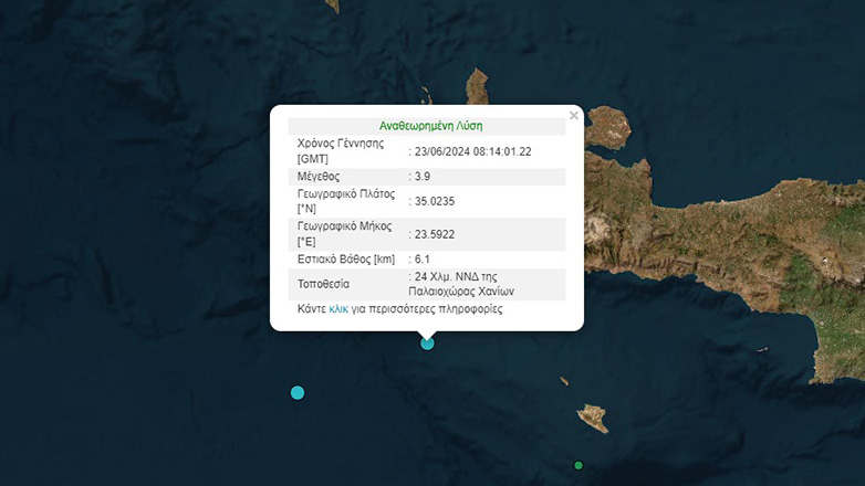 Σεισμική δόνηση μεγέθους 3,9 βαθμών της Κλίμακας Ρίχτερ σημειώθηκε στις 11:14 το πρωί της Κυριακής (23/6) στη θαλάσσια περιοχή της Κρήτης.