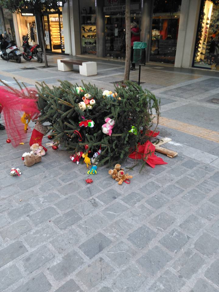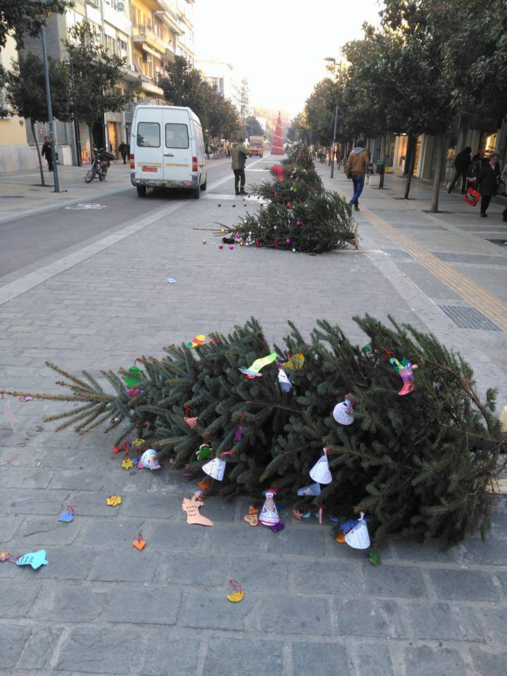 Άγνωστοι ξήλωσαν και πέταξαν κάτω δεκάδες χριστουγεννιάτικα δέντρα που βρίσκονταν τοποθετημένα κατά μήκος του πεζόδρομου.