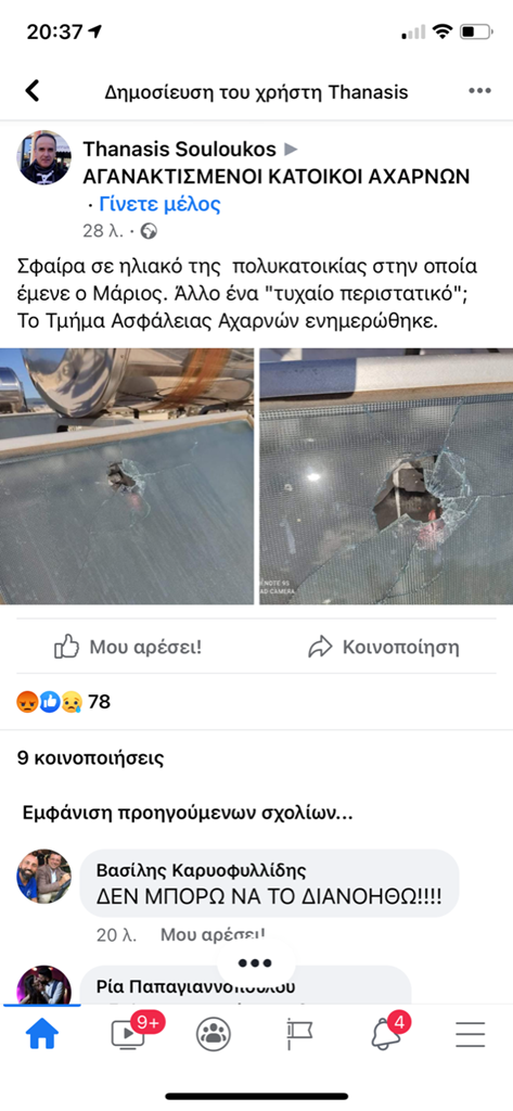 Όπως καταγγέλλει ο πατέρας του Μάριου Σουλούκου, του παιδιού το οποίο είχε χάσει τη ζωή του το 2017 στο Μενίδι από αδέσποτη σφαίρα μέσα στο σχολείο του, σήμερα διαπίστωσε ότι στον ηλιακό θερμοσίφωνα στην ταράτσα της πολυκατοικίας του υπάρχουν σημάδια από σφαίρα, προφανώς αδέσποτη. Ο πατέρας του θύματος κατήγγειλε το περιστατικό στην αστυνομία Αχαρνών.