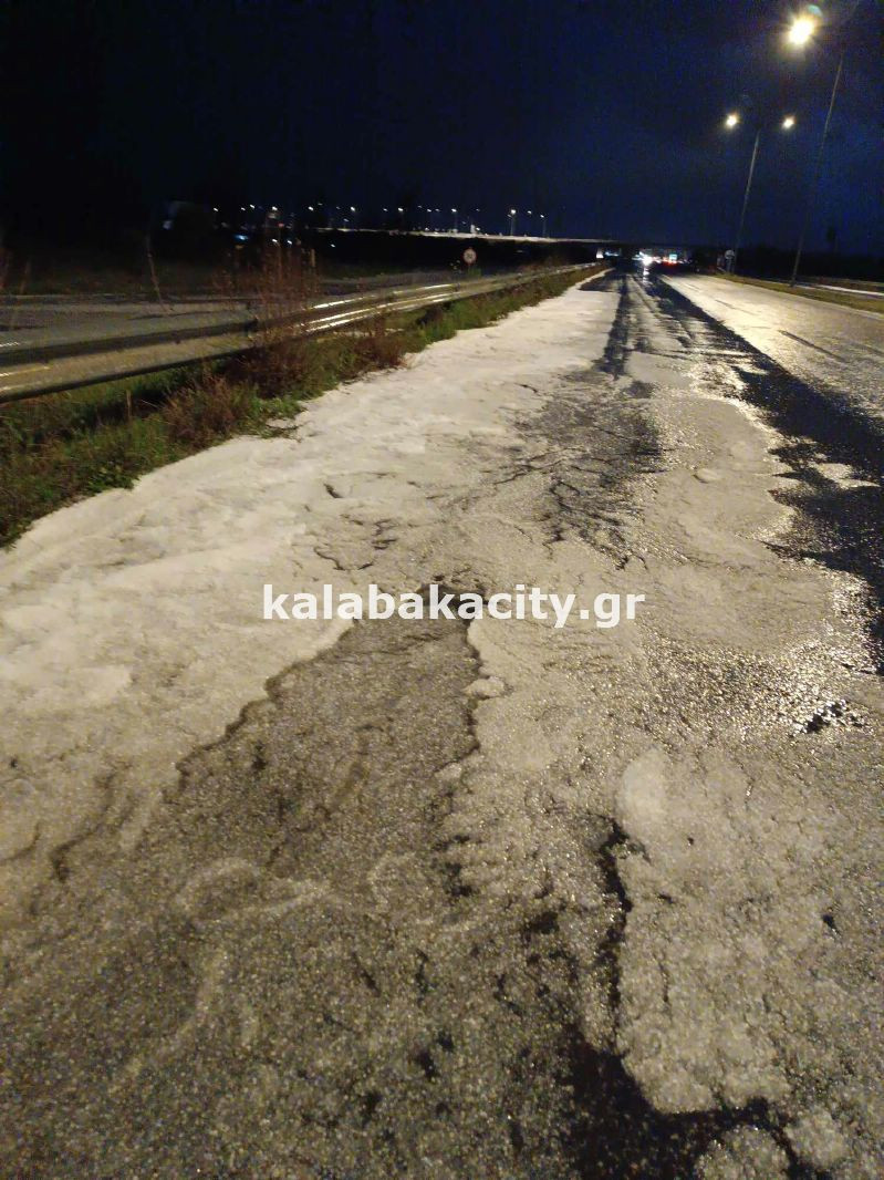 Η ισχυρή χαλαζόπτωση προκάλεσε προβλήματα στην κυκλοφορία των οχημάτων στην εθνική οδό Τρικάλων – Καλαμπάκας από την ποσότητα χαλαζιού που έπεσε.