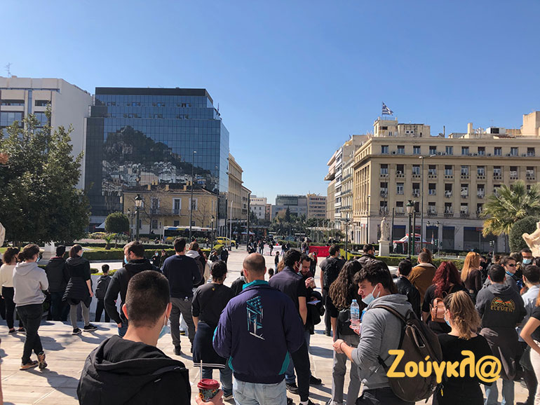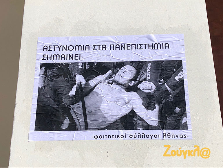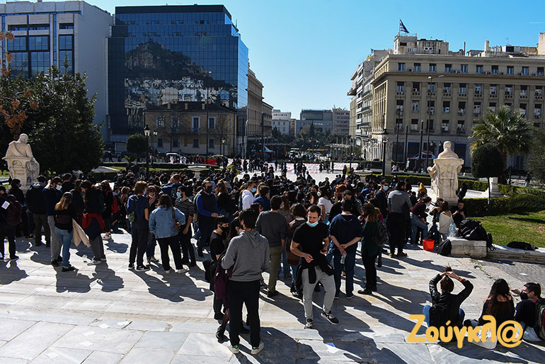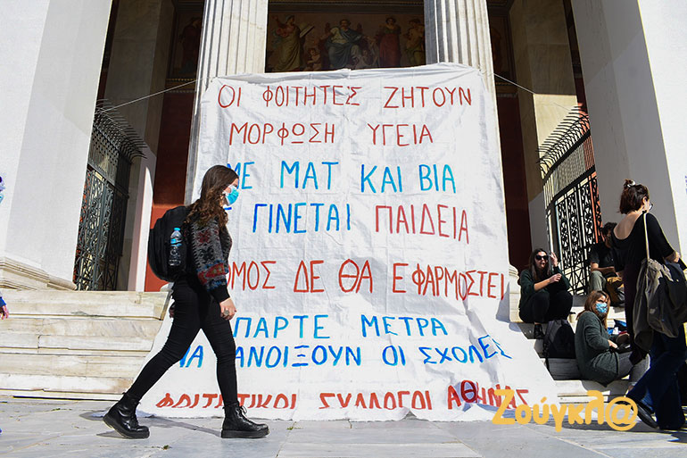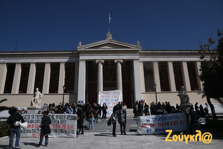 «Αλληλεγγύη στους συλληφθέντες. Κάτω ο νόμος Κεραμέως-Χρυσοχοΐδη. Έξω από τις σχολές η αστυνομία» είναι το κεντρικό σύνθημα των συγκεντρωμένων.