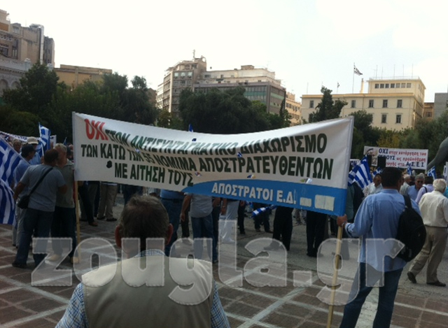Περίπου 400 απόστρατοι συγκεντρώθηκαν στην πλατεία Κλαυθμώνος και πραγματοποίησαν πορεία προς την πλατεία Συντάγματος. Στη συνέχεια επέδωσαν ψήφισμα στον πρόεδρο της Βουλής και τους επικεφαλής του Υπουργείου Οικονομικών.