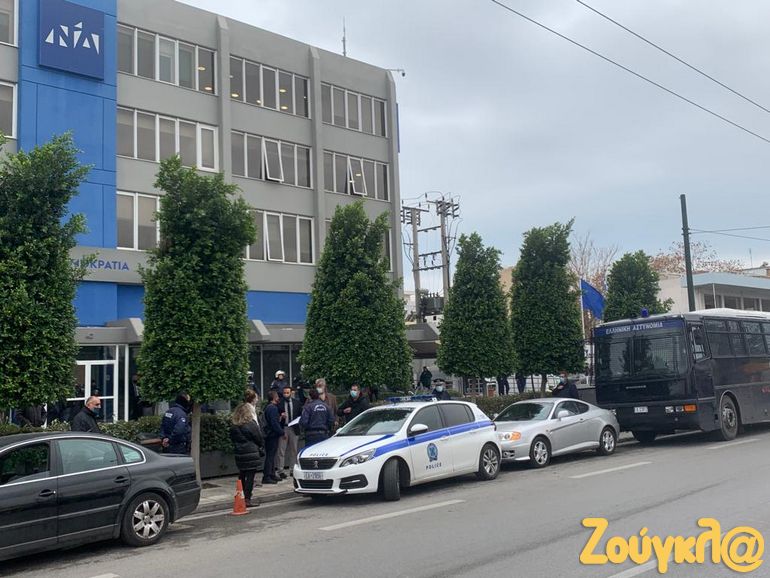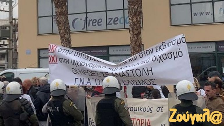 Συγκέντρωση διαμαρτυρίας πραγματοποίησαν υγειονομικοί που βρίσκονται σε αναστολή, έξω από τα γραφεία της Νέας Δημοκρατίας στο Μοσχάτο.