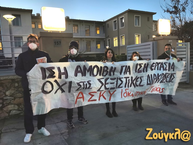 Οι συγκεντρωμένοι φώναζαν συνθήματα κατά του εργοδότη των ιδιωτικών ψυχιατρικών κλινικών και κρατούσαν πανό στο οποίο αναγραφόταν: «Ίση αμοιβή για ίση εργασία. Όχι στις σεξιστικές διακρίσεις».