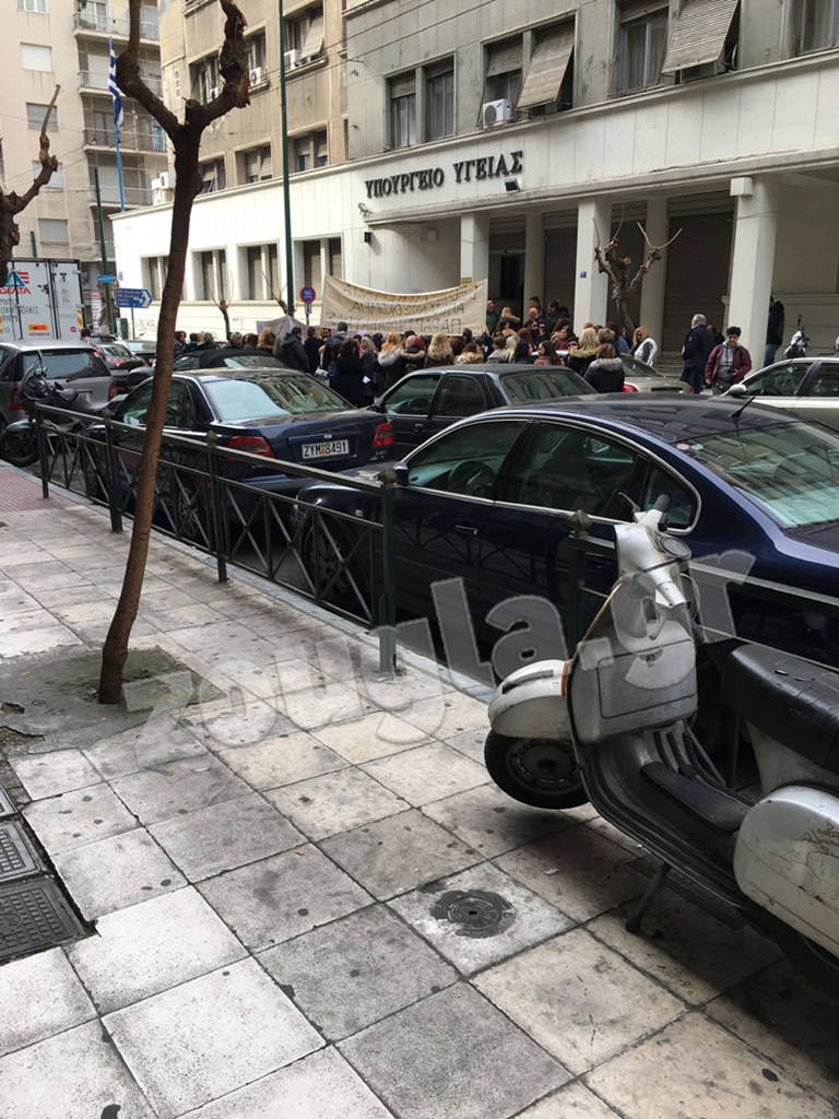 Συγκέντρωση διαμαρτυρίας πραγματοποιούν έξω από το Υπουργείο Υγείας στην οδό Αριστοτέλους 17, μέλη της Πανελλαδικής Ένωσης Νοσοκόμων και Νοσηλευτριών Αποκλειστικής Απασχόλησης «Αλληλεγγύη», με στόχο όπως αναφέρουν σε ανακοίνωσή τους να σταλεί μήνυμα στην κυβέρνηση. «Όχι στα δουλεμπορικά γραφεία, Όχι στην παράνομη εργασία. Όχι στην γκετοποίηση των νοσοκομείων».