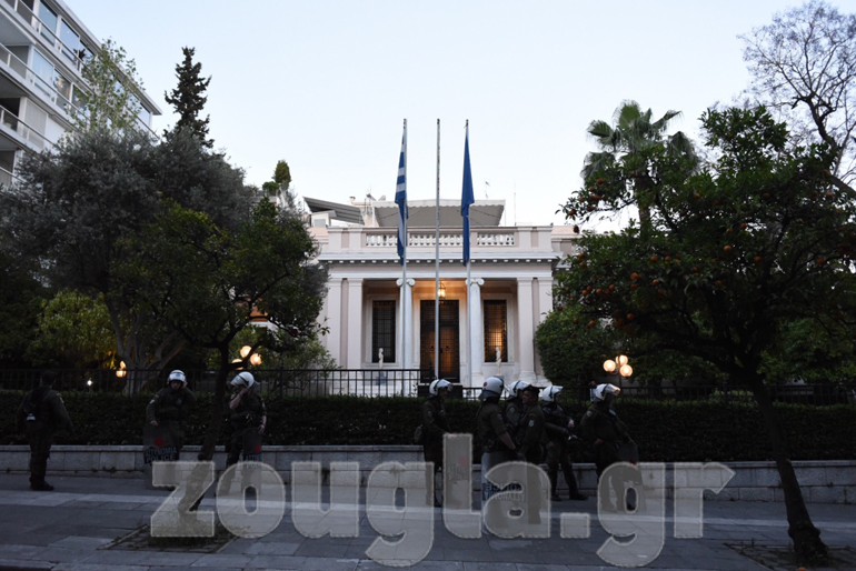 Εργαζόμενοι από δεκάδες σωματεία του συσπειρώνονται στο ΠΑΜΕ πραγματοποίησαν λίγο μετά τις 19.00 το απόγευμα της Πέμπτης παράσταση διαμαρτυρίας έξω από το Μέγαρο Μαξίμου, καταγγέλλοντας την πολιτική της κυβέρνησης και το ασφαλιστικό-φορολογικό νομοσχέδιο.