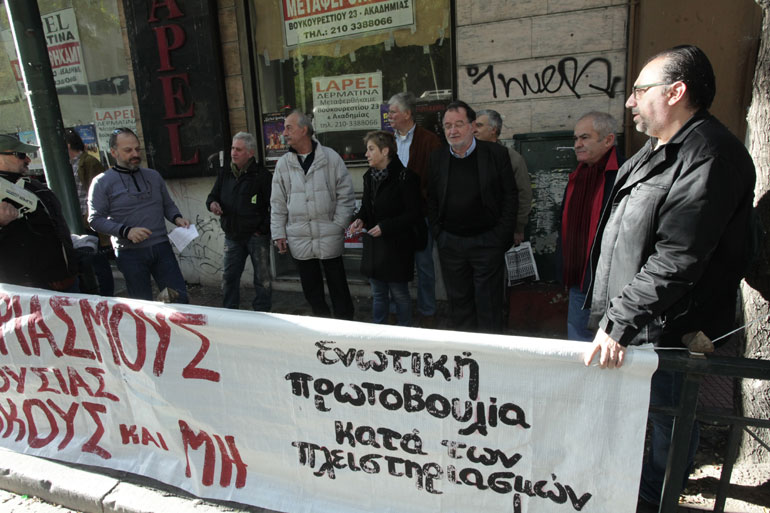 Συγκέντρωση διαμαρτυρίας πραγματοποιούν οργανώσεις και φορείς έξω από συμβολαιογραφικό γραφείο όπου διενεργείται η διαδικασία του ηλεκτρονικού πλειστηριασμού, ζητώντας την ακύρωσή του.