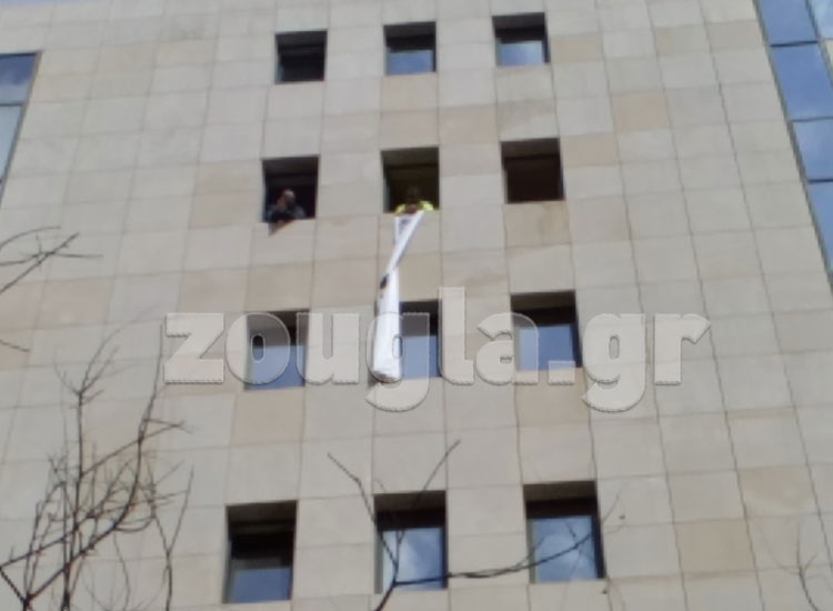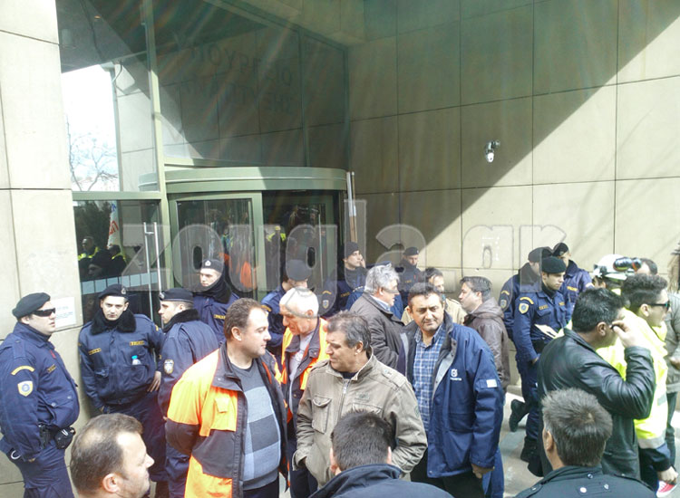 Oι εργαζόμενοι κατέκλυσαν την είσοδο του Υπουργείου και φώναξαν συνθήματα υπέρ της εργασίας τους, ενώ ορισμένοι ανέβηκαν στον έκτο όροφο του υπουργείου που βρίσκεται το γραφείο του υπουργού, και κρέμασαν πανό.