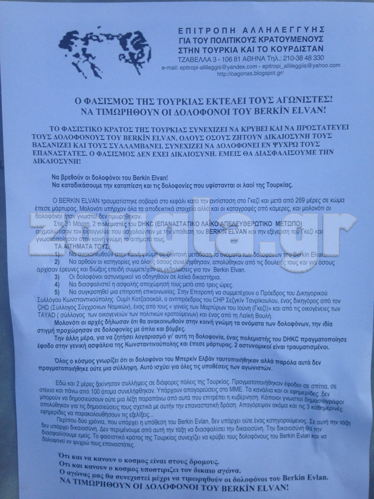 Συγκέντρωση διαμαρτυρίας για τη δολοφονία του Μπερκίν Ελβάν πραγματοποίησε στα Προπύλαια στις 18.00 το απόγευμα της Πέμπτης η Επιτροπή Αλληλεγγύης για τους Πολιτικούς Κρατούμενους στην Τουρκία και το Κουρδιστάν.