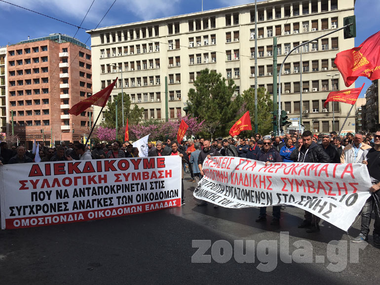 Στο Υπουργείο Εργασίας μετέβησαν οι οικοδόμοι, οι οποίοι από το πρωί πραγματοποιούν συγκεντρώσεις διαμαρτυρίας στο κέντρο της Αθήνας, με αιτήματα την υπογραφή Κλαδικής ΣΣΕ, αυξήσεις σε μεροκάματα και μισθούς, μέτρα για την προστασία των ανέργων και την αναθέρμανση της οικοδομικής δραστηριότητας με επίκεντρο τις λαϊκές ανάγκες και αναγνώριση και διανομή των «υπέρ αγνώστων» ενσήμων.