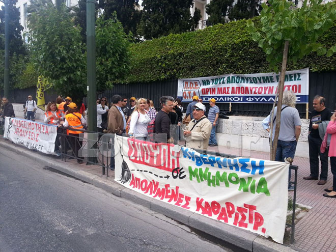 Πανελλαδική συγκέντρωση διαμαρτυρίας κατά της διαθεσιμότητας πραγματοποιούν από τις 12 το μεσημέρι, στο υπουργείο Διοικητικής Μεταρρύθμισης, σχολικοί φύλακες, καθηγητές, καθαρίστριες Υπουργείου Οικονομικών, υπάλληλοι Υπουργείου Πολιτισμού, Πανεπιστήμια κ.λπ.