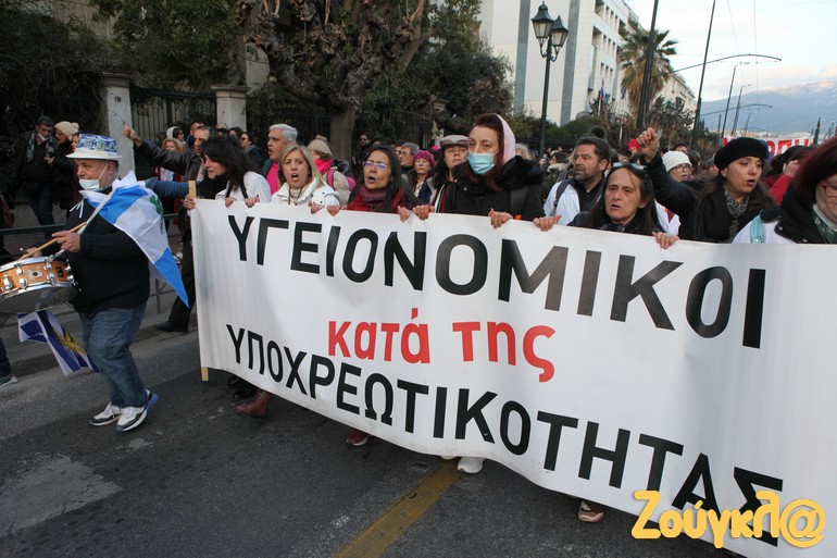 Η συγκέντρωση, η οποία διοργανώθηκε από τους «Υγειονομικούς κατά της Υποχρεωτικότητας», ολοκληρώθηκε με πορεία προς το Σύνταγμα.