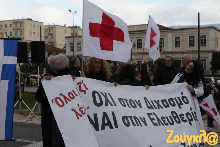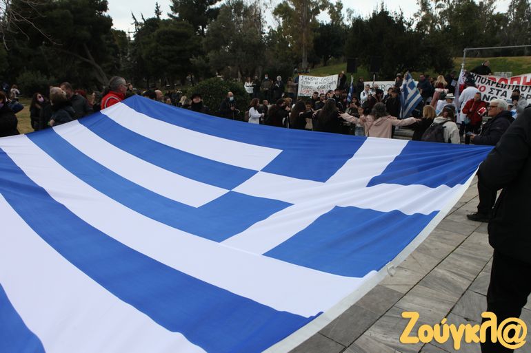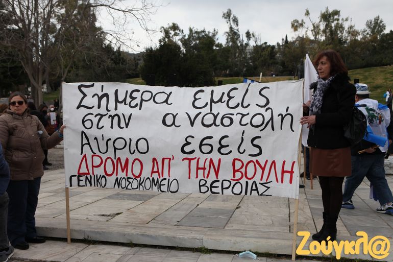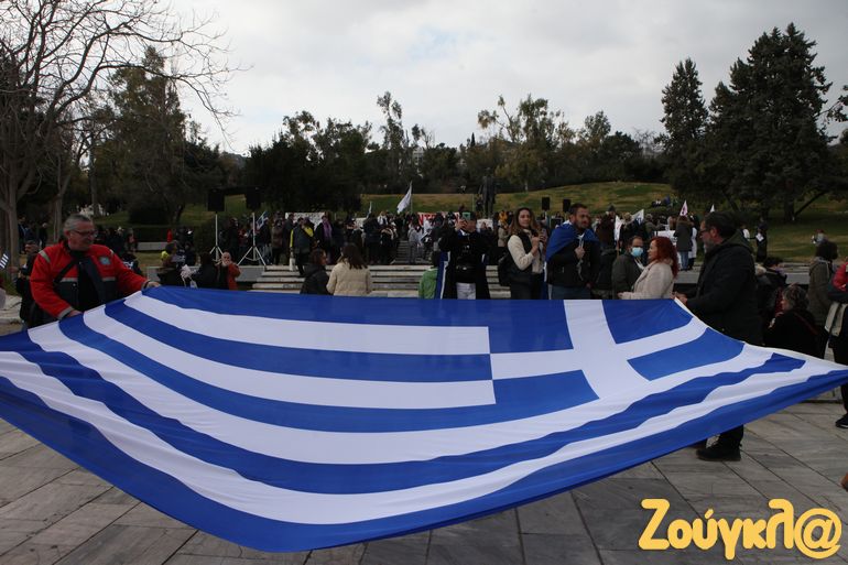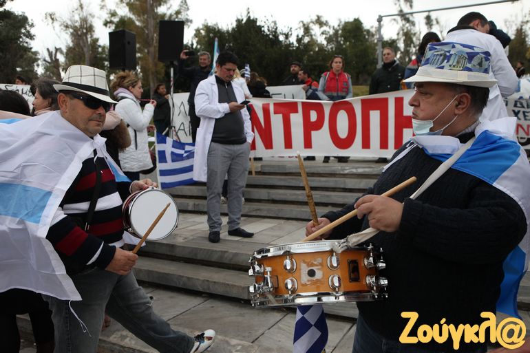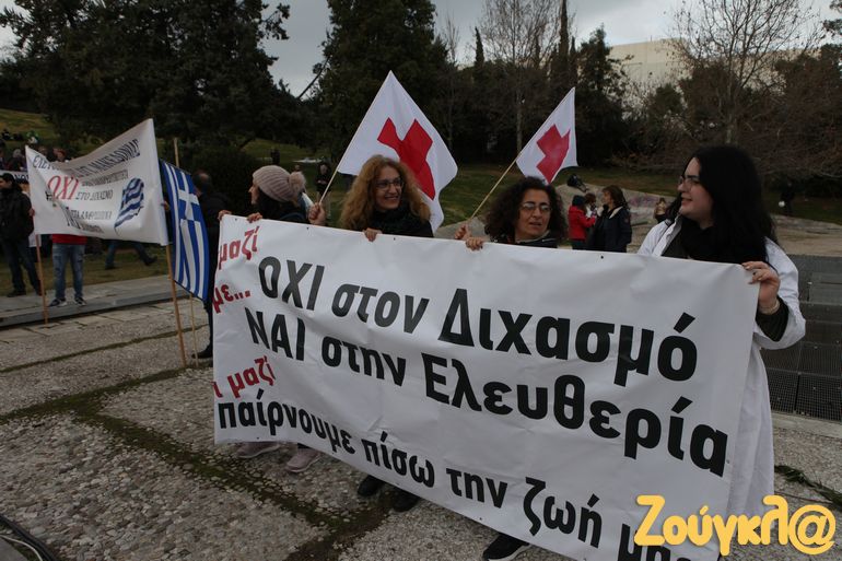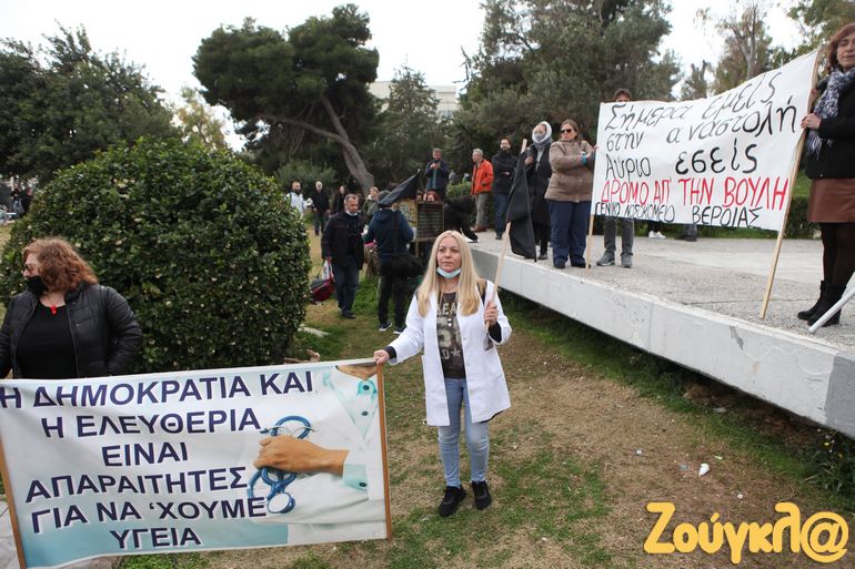 Η συγκέντρωση, η οποία διοργανώθηκε από τους «Υγειονομικούς κατά της Υποχρεωτικότητας», ολοκληρώθηκε με πορεία προς το Σύνταγμα.
