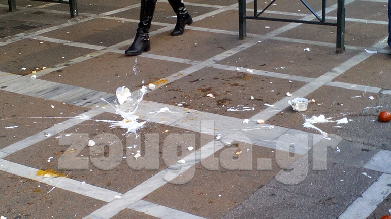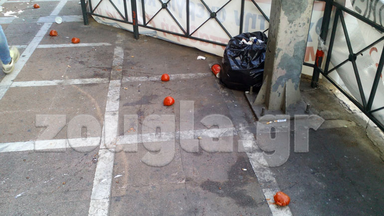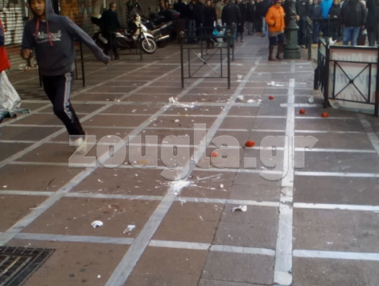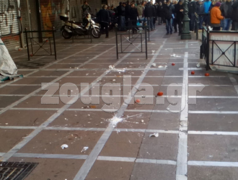 Μερίδα διαδηλωτών πέταξε αβγά, ντομάτες και γιαούρτια στο κτήριο του Υπουργείου Εργασίας.
