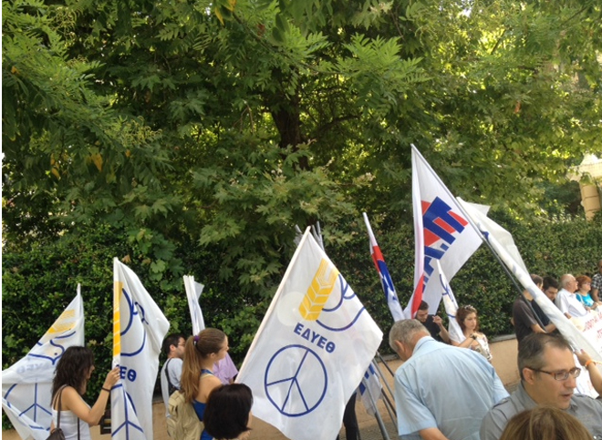 Με σύνθημα «Το Ισραήλ δολοφονεί παιδιά και αμάχους στην Παλαιστίνη με τις πλάτες ΗΠΑ-ΕΕ – Παλαιστίνη ελεύθερη και ανεξάρτητη» μέλη της ΕΔΥΕΘ (Ένωση για τη Διεθνή Ύφεση και Ειρήνη Θεσσαλονίκης) και μέλη του ΠΑΜΕ πραγματοποιούν συγκέντρωση διαμαρτυρίας μπροστά από το ΥΜΑΘ για τις επιθέσεις του Ισραήλ στην Παλαιστίνη. Αντιπροσωπεία των διαδηλωτών βρίσκεται αυτή την ώρα στο ΥΜΑΘ προκειμένου να ζητήσει από την Κυβέρνηση να σταματήσει κάθε στρατιωτική συνεργασία Ελλάδας-Ισραήλ.