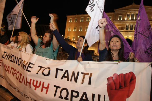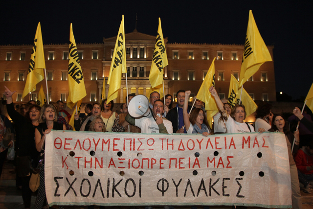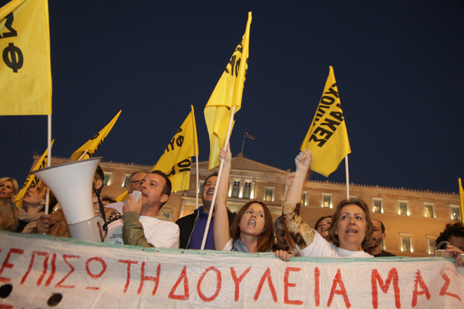 Κρατώντας πανό και φωνάζοντας συνθήματα κατά του ΥΠΟΙΚ και του Υπουργείου Διοικητικής Μεταρρύθμισης, οι διαδηλωτές ζήτησαν τη ματαίωση της αξιολόγησης στο Δημόσιο, την επαναπρόσληψη απολυμένων δημοσίων υπαλλήλων, την αποκατάσταση μισθών και συντάξεων και την αύξηση των κονδυλίων στους τομείς της Υγείας και της Παιδείας.