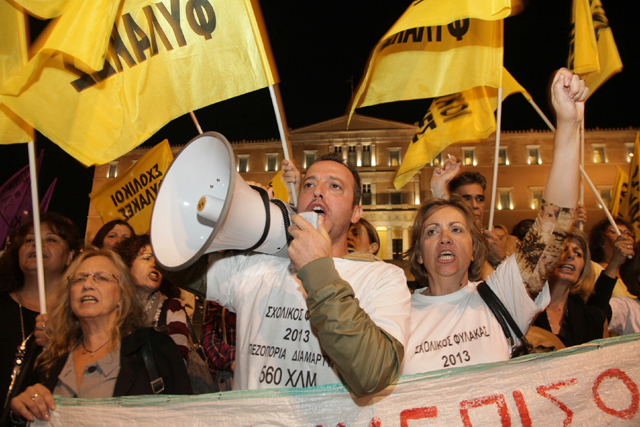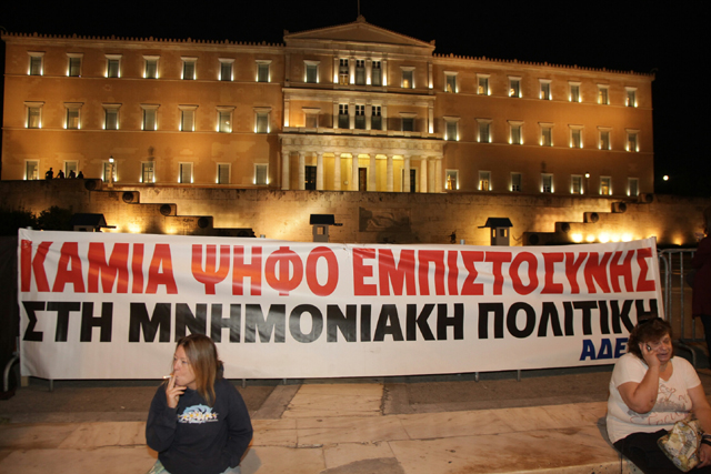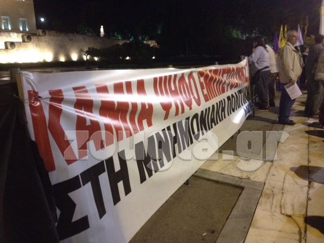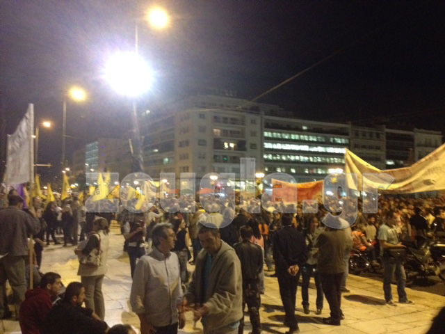 Περίπου 1.500 διαδηλωτές συγκεντρώθηκαν λίγο μετά τις 20.00 το βράδυ της Παρασκευής μπροστά από το Κοινοβούλιο, όπου βρίσκεται σε εξέλιξη η συνεδρίαση της ολομέλειας για την παροχή ψήφου εμπιστοσύνης στην κυβέρνηση του Αντώνη Σαμαρά.