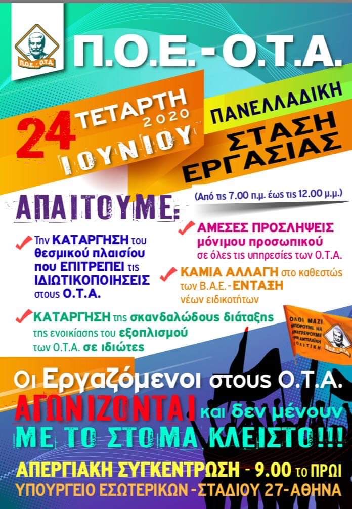 Πανελλαδική στάση εργασίας πραγματοποιεί η ΠΟΕ-ΟΤΑ σήμερα Τετάρτη 24 Ιουνίου, από τις 07:00 έως τις 12:00. Παράλληλα πραγματοποιείται συγκέντρωση διαμαρτυρίας έξω από το Υπουργείο Εσωτερικών, στην πλατεία Κλαυθμώνος.