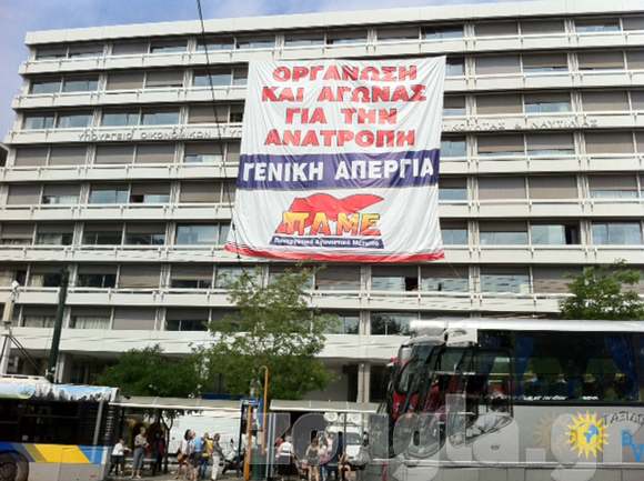 Παράλληλα, μέλη του ΠΑΜΕ ανάρτησαν ένα γιγαντιαίο πανό στην πρόσοψη του κτηρίου, όπου στεγάζεται το υπουργείο Οικονομικών.