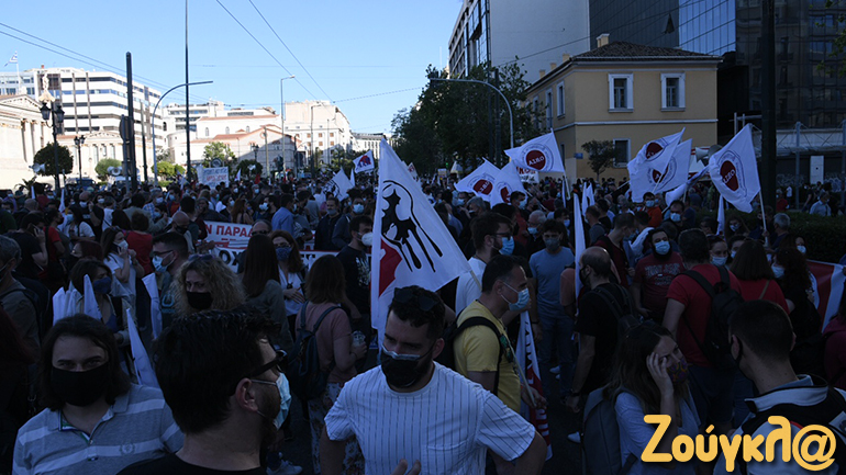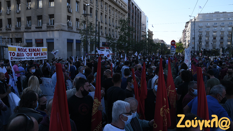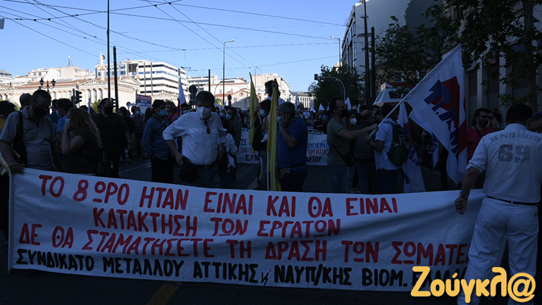 Οι περίπου 2.000 συγκεντρωμένοι διαμαρτύρονται για το νομοσχέδιο και ζητούν την απόσυρσή του και τη διατήρηση του 8ωρου εργασίας.