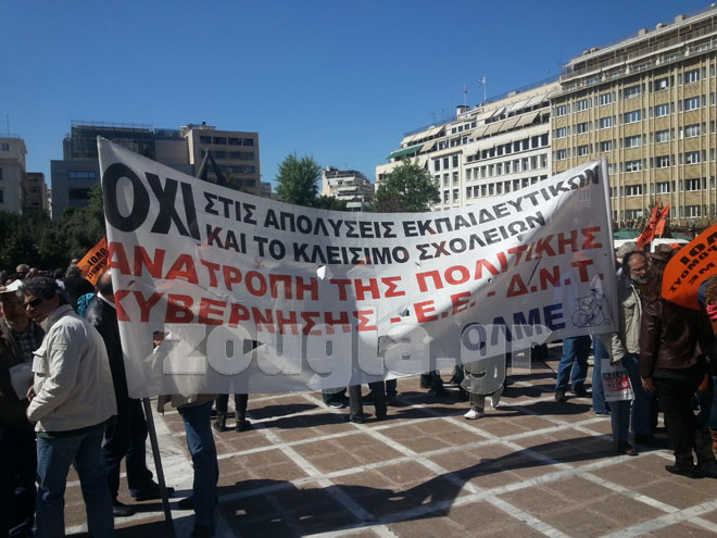 Για σήμερα οι εκπαιδευτικοί, εκτός από 24ωρη απεργία διοργάνωσαν συλλαλητήριο στην πλ. Κλαυθμώνος από τις 11.00 ενώ λίγο πριν τις 13.00, οι εκπαιδευτικοί πραγματοποιώντας πορεία από την Κλαυθμώνος έφτασαν στο υπουργείο Διοικητικής Μεταρρύθμισης. Εκεί, ζήτησαν συνάντηση με τον υπουργό Κυριάκο Μητσοτάκη. Τελικά, οι εκπαιδευτικοί δεν συναντήθηκαν με τον υπουργό και αυτή την ώρα μεταβαίνουν στο υπουργείο Παιδείας.