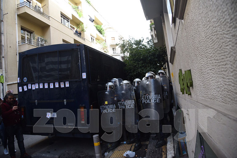 Οι διαδηλωτές κρατούσαν πανό και φώναζαν συνθήματα κατά των πλειστηριασμών. Λίγο μετά τις 15.00 σημειώθηκε μικροένταση μεταξύ των διαδηλωτών και των ανδρών των ΜΑΤ, ενώ έγινε και χρήση χημικών.