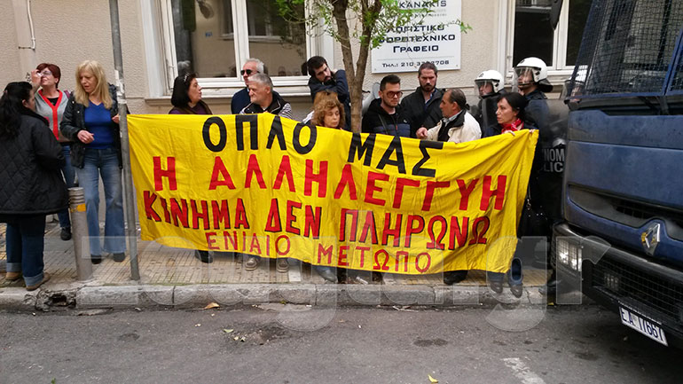 Έξω από συμβολαιογραφείο που βρίσκεται επί της οδού Σκουφά στο Κολωνάκι συγκεντρώθηκαν το μεσημέρι της Τετάρτης πολίτες και μέλη συλλογικοτήτων που αντιδρούν στους πλειστηριασμούς.