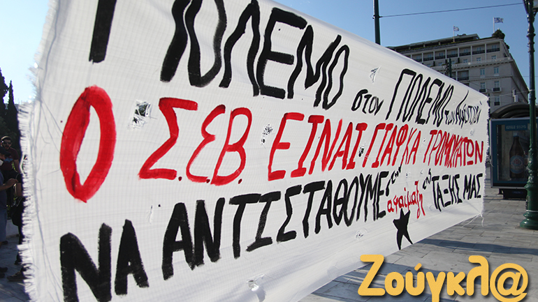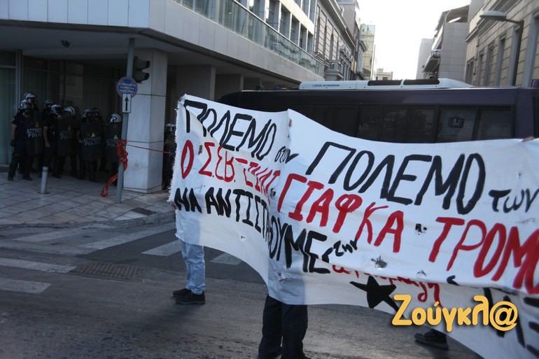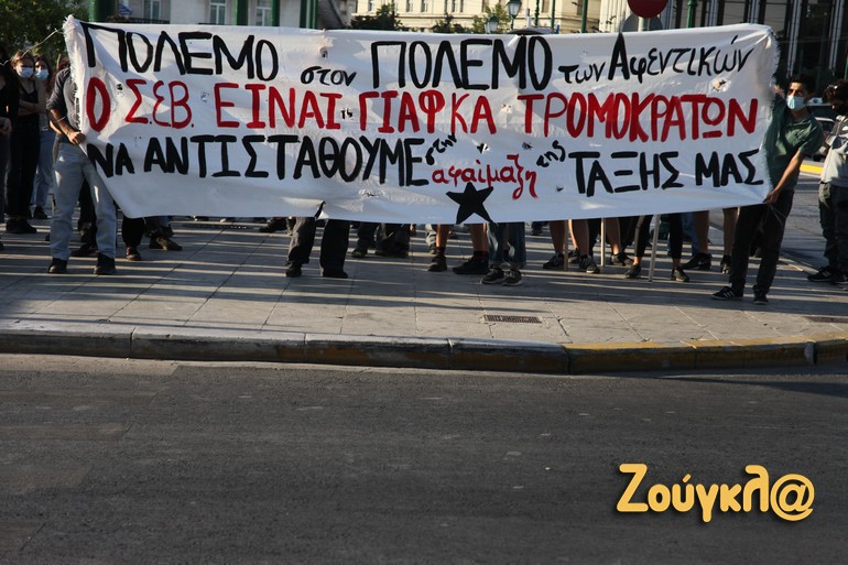 Συγκέντρωση πραγματοποιήθηκε το απόγευμα της Τρίτης από μέλη αντιεξουσιαστικών συλλογικοτήτων έξω από τα γραφεία του Συνδέσμου Επιχειρήσεων και Βιομηχάνων στο Σύνταγμα, ως ένδειξη διαμαρτυρίας για το εργασιακό νομοσχέδιο.