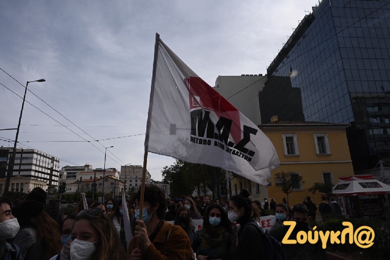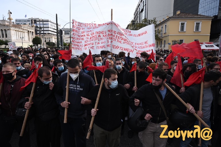 Οι παρευρισκόμενοι φέρουν πανό με συνθήματα και σημαίες. Συγκεντρώθηκαν στα Προπύλαια και πραγματοποιούν πορεία προς τη Βουλή, αντιτιθέμενοι στην πανεπιστημιακή αστυνομία, τη συγχώνευση τμημάτων και το όριο φοίτησης.