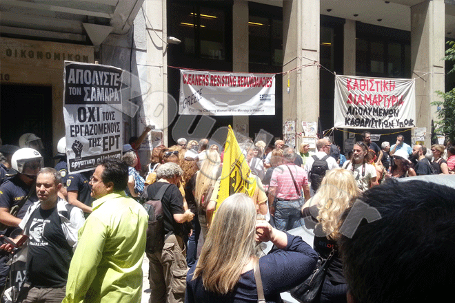 Ακολούθησε πορεία διαμαρτυρίας, η οποία κατέληξε στο Υπουργείο Οικονομικών στην Καραγιώργη Σερβίας στο Σύνταγμα, όπου οι διαδηλωτές εξέφρασαν τη συμπαράστασή τους στις απολυμένες καθαρίστριες.