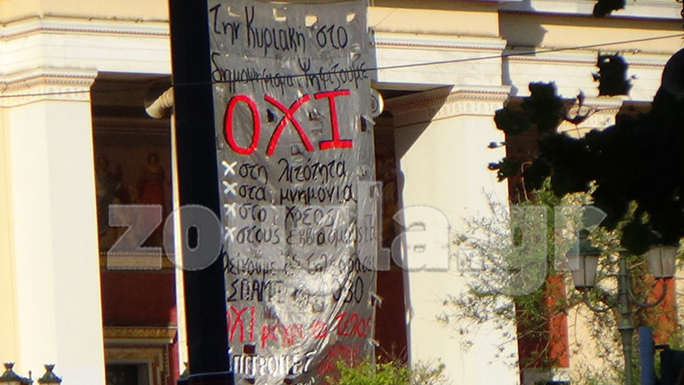 Συγκέντρωση υπέρ του «Όχι» στο δημοψήφισμα της Κυριακής πραγματοποίησαν στα Προπύλαια οι ΑΝΤΑΡΣΥΑ-ΜΑΡΣ και άλλες συλλογικότητες της Αριστεράς.