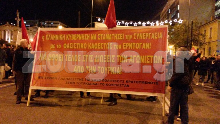 Σε σύσκεψη που έγινε στο Πολυτεχνείο, τη Δευτέρα 4 Δεκεμβρίου, ύστερα από κάλεσμα της “Επιτροπής Αλληλεγγύης στους Πολιτικούς Κρατούμενους στην Τουρκία και το Κουρδιστάν”, με συμμετοχή πολλών ελληνικών οργανώσεων και συλλογικοτήτων, αποφασίσαμε να καλέσουμε όλο το λαό την Πέμπτη 7 Δεκέμβρη 2017, στις 6 μ.μ., σε συγκέντρωση διαμαρτυρίας στα Προπύλαια και πορεία στη βουλή. Καταγγέλλουμε την επίσκεψη του Ερντογάν και, επίσης, τις συλλήψεις 9 Τούρκων αγωνιστών πολιτικών προσφύγων, που οι ελληνικές αρχές δίνουν “πεσκέσι” στον Eρντογάν.