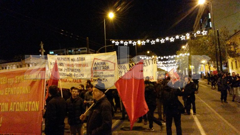 Στα Προπύλαια συγκεντρώθηκαν στις 18.00 περίπου 500 άτομα τα οποία διαδήλωσαν κατά της επίσκεψης του Τούρκου προέδρου, Ταγίπ Ερντογάν στη χώρα μας.