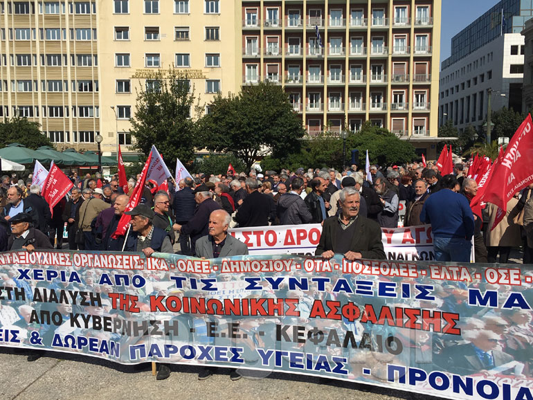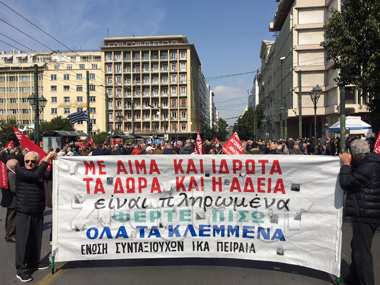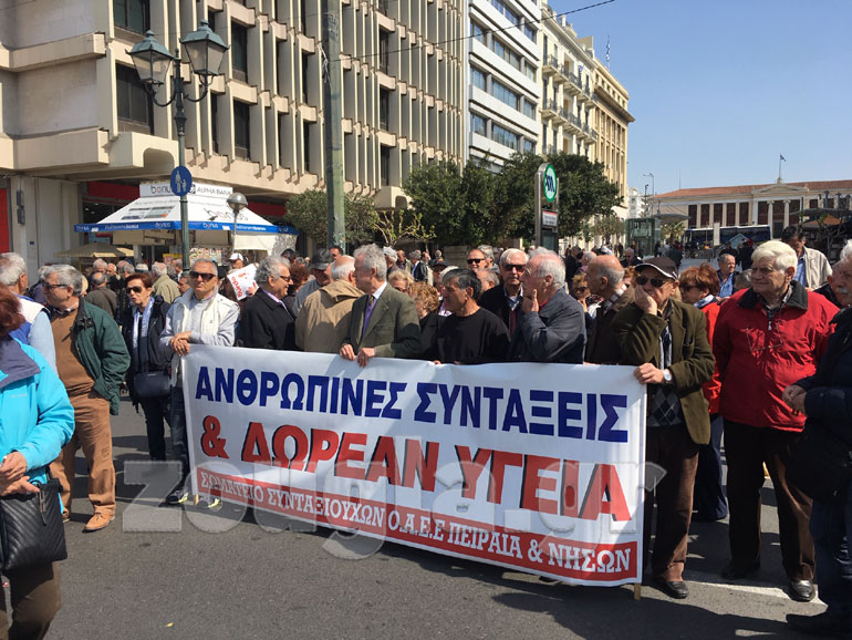 Ολοκληρώθηκε το παναττικό συλλαλητήριο των συνταξιούχων, το οποίο πραγματοποίησαν στο κέντρο της Αθήνας οι συνεργαζόμενες συνταξιουχικές οργανώσεις με βασικά αιτήματα την άμεση καταβολή του δώρου Πάσχα, την αποκατάσταση των συντάξεων και τη δημόσια δωρεάν υγεία. Οι συνταξιούχοι ζήτησαν συνάντηση με τον πρωθυπουργό, η οποία προγραμματίστηκε για το ερχόμενο Σάββατο στις 13.00.