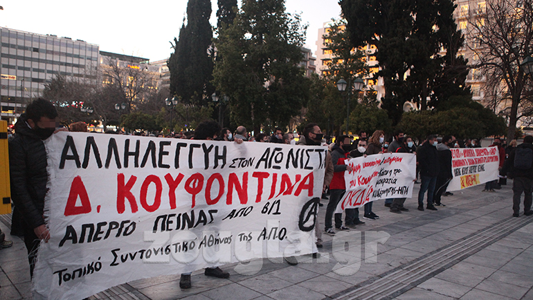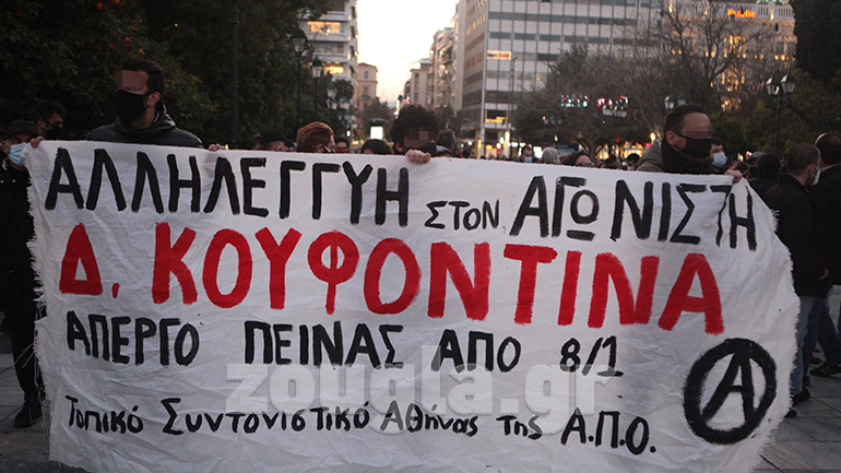 Συγκεκριμένα, πραγματοποιήθηκε πορεία που ξεκίνησε στα Προπύλαια και έφτασε στην Ομόνοια, σε ένδειξη συμπαράστασης προς τον Δημήτρη Κουφοντίνα που άρχισε απεργία πείνας στις 8 Ιανουαρίου 2021 με αίτημα την μεταγωγή του στις φυλακές Κορυδαλλού, ενώ από τη Δευτέρα 22 Φεβρουαρίου ξεκίνησε και απεργία δίψας.
