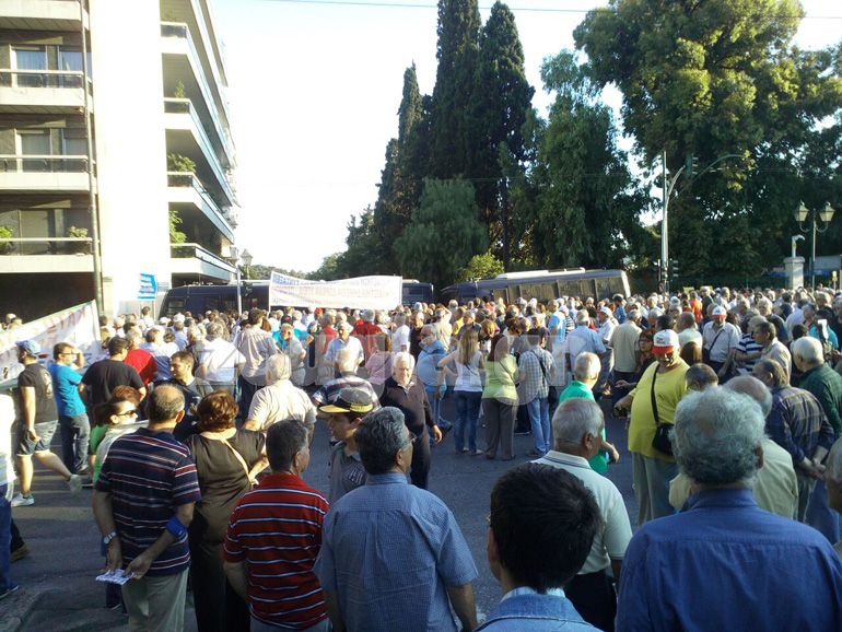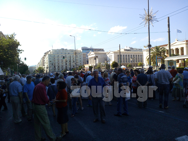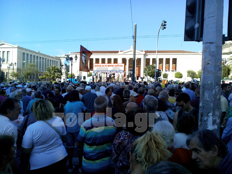 Συγκέντρωση διαμαρτυρίας πραγματοποιούν οι συνταξιούχοι στελέχη του ΠΑΜΕ αυτή την ώρα στο κέντρο της Αθήνας. Οι συγκεντρωθέντες διαμαρτύρονται για τις περικοπές των συντάξεων και ζητούν άμεση επαναφορά των απολαβών που περικόπηκαν λόγω της πολιτικής των μνημονίων.