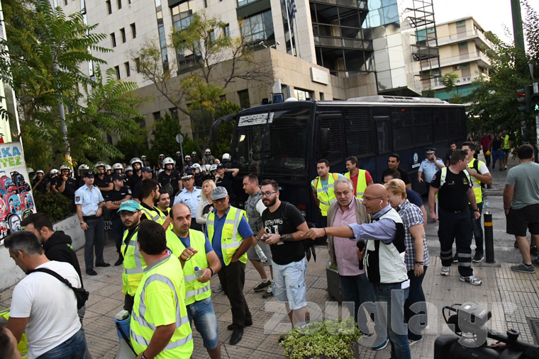 Το κτήριο του υπουργείου θύμιζε το πρωί «φρούριο», καθώς βρίσκονταν εκεί αρκετές κλούβες των ΜΑΤ, προκειμένου να αποφευχθεί νέα κατάληψη, όπως εκείνη που συνέβη την τελευταία φορά που κατέβηκαν στην Αθήνα.